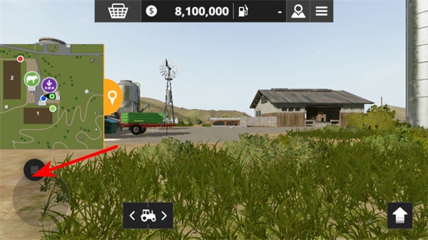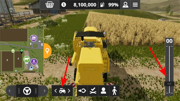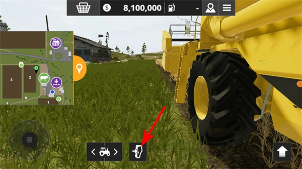 在农场场景里,按照红色箭头的指示,点击左边的功能按钮,就能切换到收割机等对应的农机设备,为接下来的农业作业做好准备。