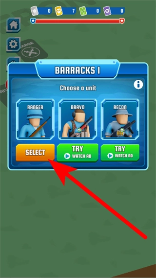 进入兵营BARRACKS I界面后,挑选RANGER这类基础单位,再点击SELECT按钮来确认要出战的兵种。