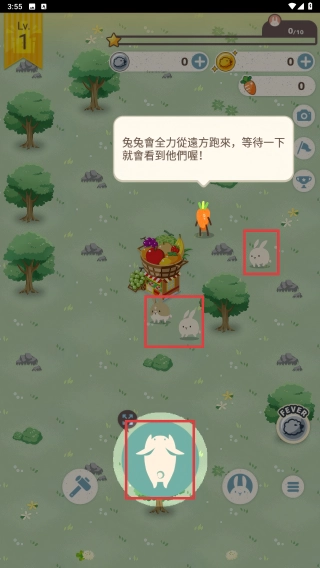 持续点击屏幕,等待小兔子从远处跑过来,然后点击兔子图标进行互动,悉心照料它们,助力它们茁壮成长。