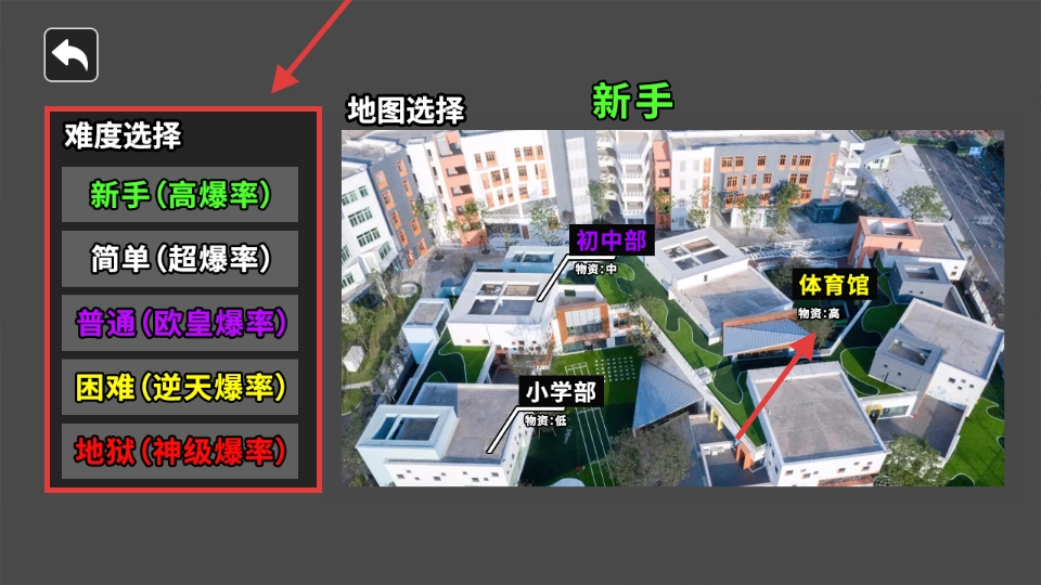 难度可以选择【新手-高爆率】或者【简单-超爆率】这两个选项,地图方面优先考虑【体育馆-物资高】和【初中部-物资中】,至于【小学部-物资低】建议暂时避开。