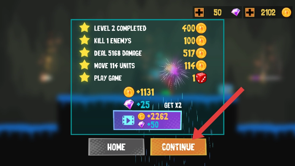 成功闯过关卡后,就能获得金币与钻石奖励,点击【CONTINUE】按钮即可开启下一关挑战。