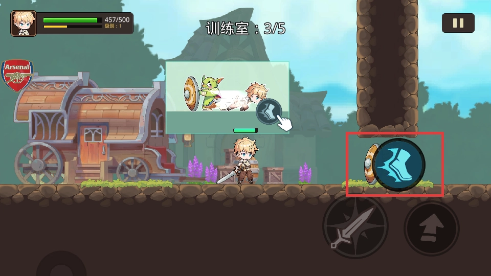 点击闪避按钮,避开敌人的盾牌,增强生存能力,成功通过训练室。