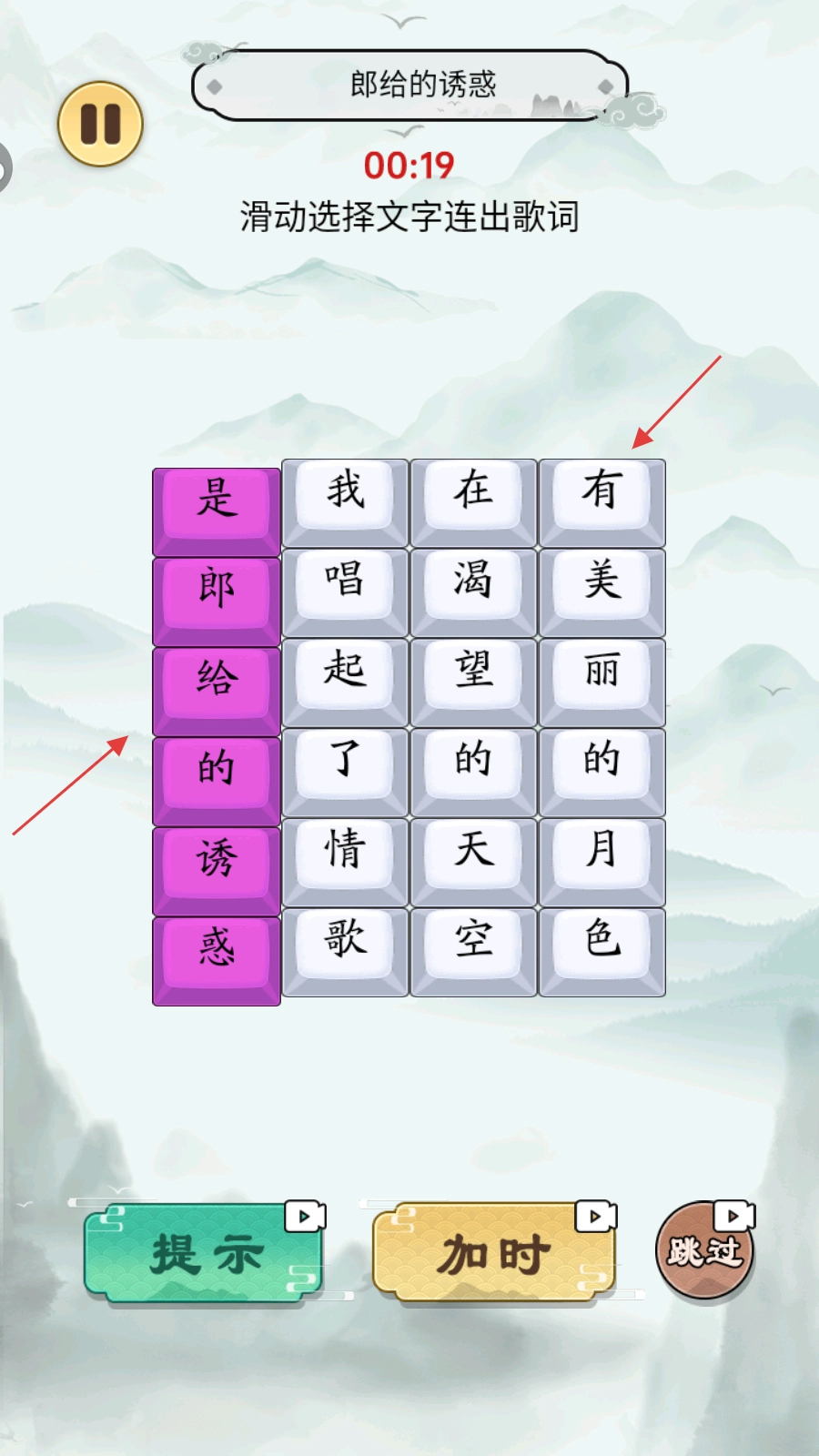 2、按照“滑动选择文字连出歌词”的规则,找出与“是郎给的诱惑”相对应的文字块。