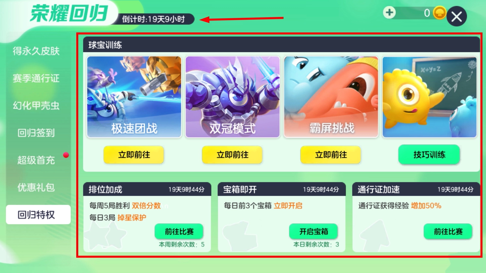 回归后可以参与【极速团战】【双冠模式】等玩法,完成排位加成任务就能获得双倍分数和掉星保护,助力提升游戏进度。