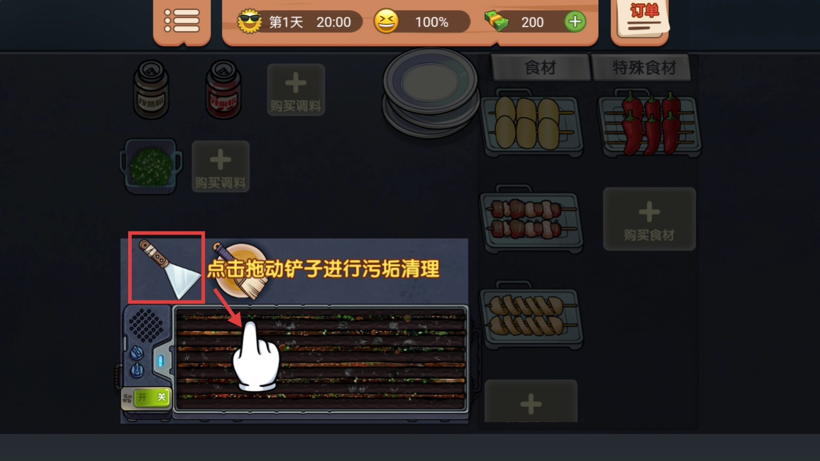 1、我们先点击并拖动【铲子】,清理掉烧烤架上的污垢,把烤架弄干净,这样才能开始烹饪哦。