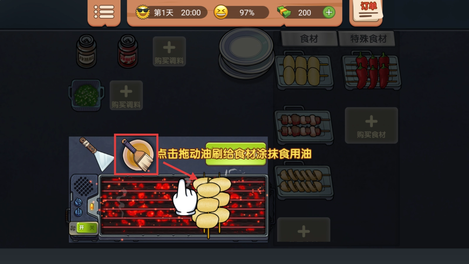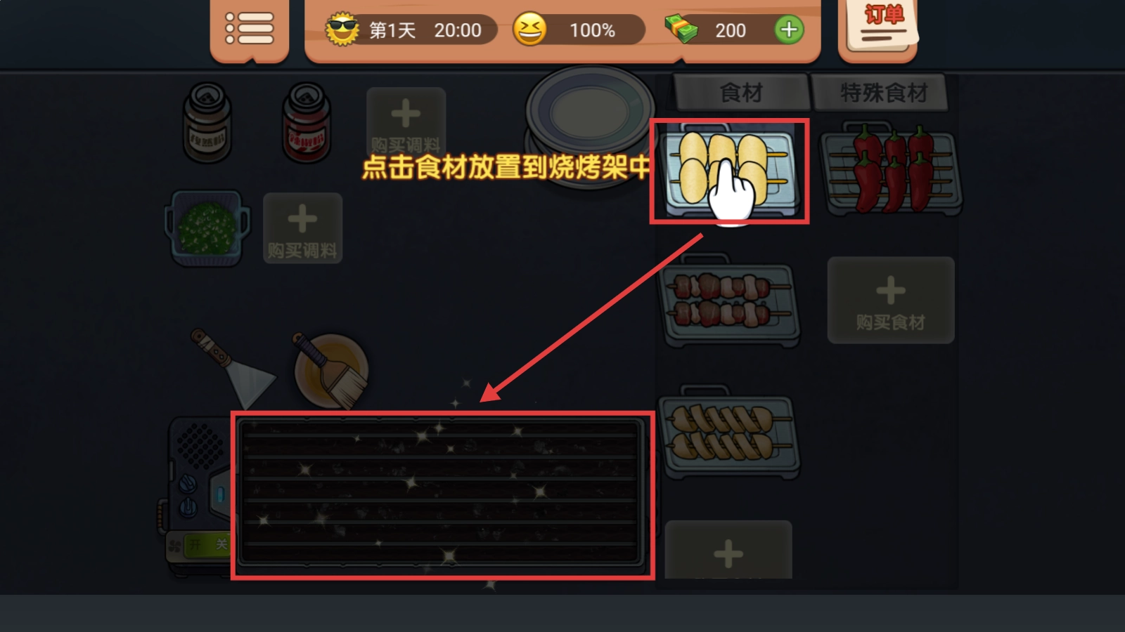 2、接下来根据顾客的需求,点击对应的食材,将它们放到烧烤架上,准备制作美味的食物啦。