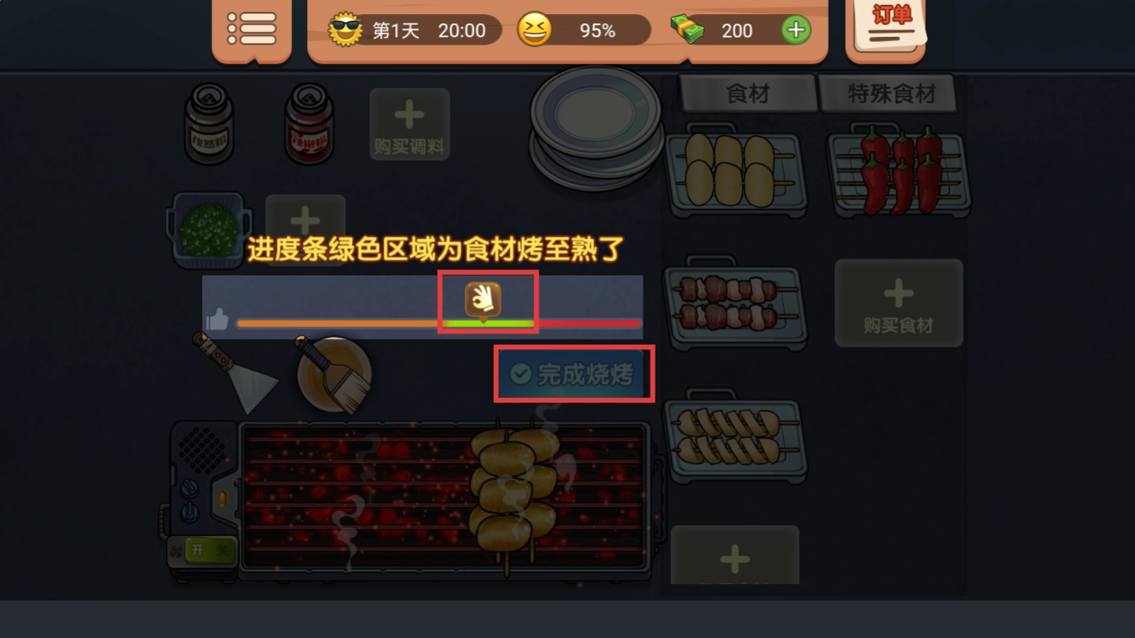 4、当进度条走到绿色区域,食材就完全熟透了,此时点击【完成烧烤】按钮,香喷喷的烧烤便新鲜出炉,赶紧去招待顾客吧。