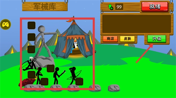 进入【军械库】界面后,点击【升级】按钮来强化部队属性,待单位战斗力提升后,再点击【就绪】按钮即可参战。