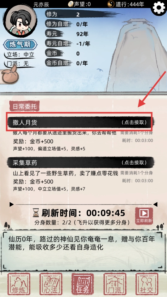 接取【撒人月货】任务,消耗1个分身,可获得500金币、100声望、5点偏道立场以及5点灵感。