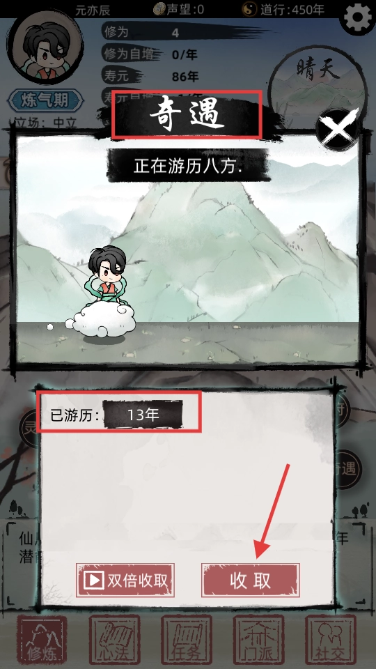 奇遇游历已历经【13】年,点击【收取】按钮,即可领取此次游历的丰厚奖励,助力提升修为等各项属性,为修仙之路添砖加瓦。