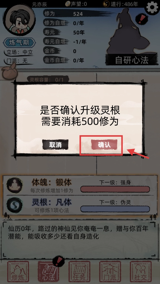 当修为达到500时,点击【确认】按钮进行灵根升级。提升灵根等级后,便能修炼更多的心法。