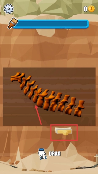 挖到化石碎片后,切换工具,拖动下方刷子,按照箭头指引轻轻擦拂去灰尘。