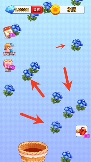 您可以用手指在屏幕底部左右滑动,以此控制花篮随之移动,同时尽量精准地对准从屏幕上方持续飘落的各种色彩斑斓的花瓣。
