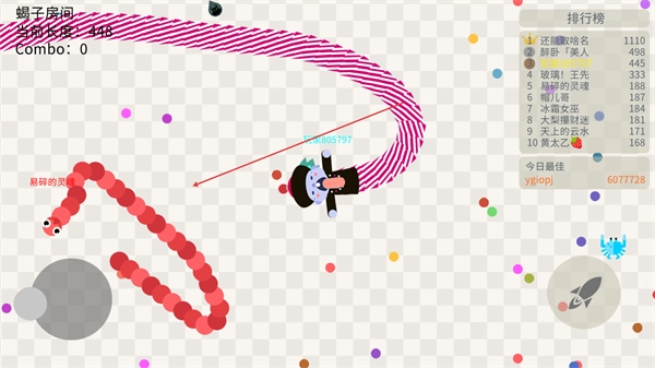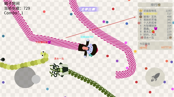 在全场比赛模式里,要避开其他玩家的蛇身,同时留意机会收集更多圆点,以此提高Combo数。