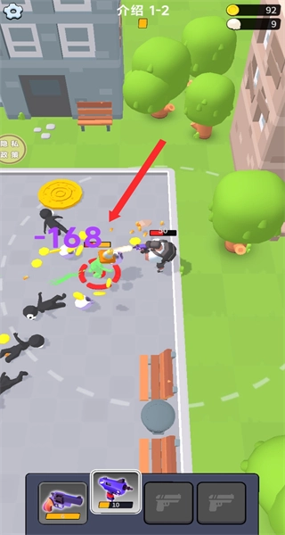 操控当前武器攻击黑色丧尸,战斗时注意数值变动,及时捡取周围金币补充资源,保持战斗状态。