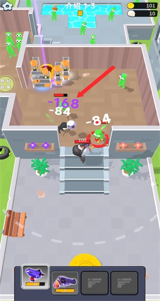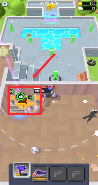 当遭遇成群的绿色丧尸时,建议切换至底部更强力的武器(例如紫色武器),以此提升攻击效率,从而快速消灭多个丧尸目标。