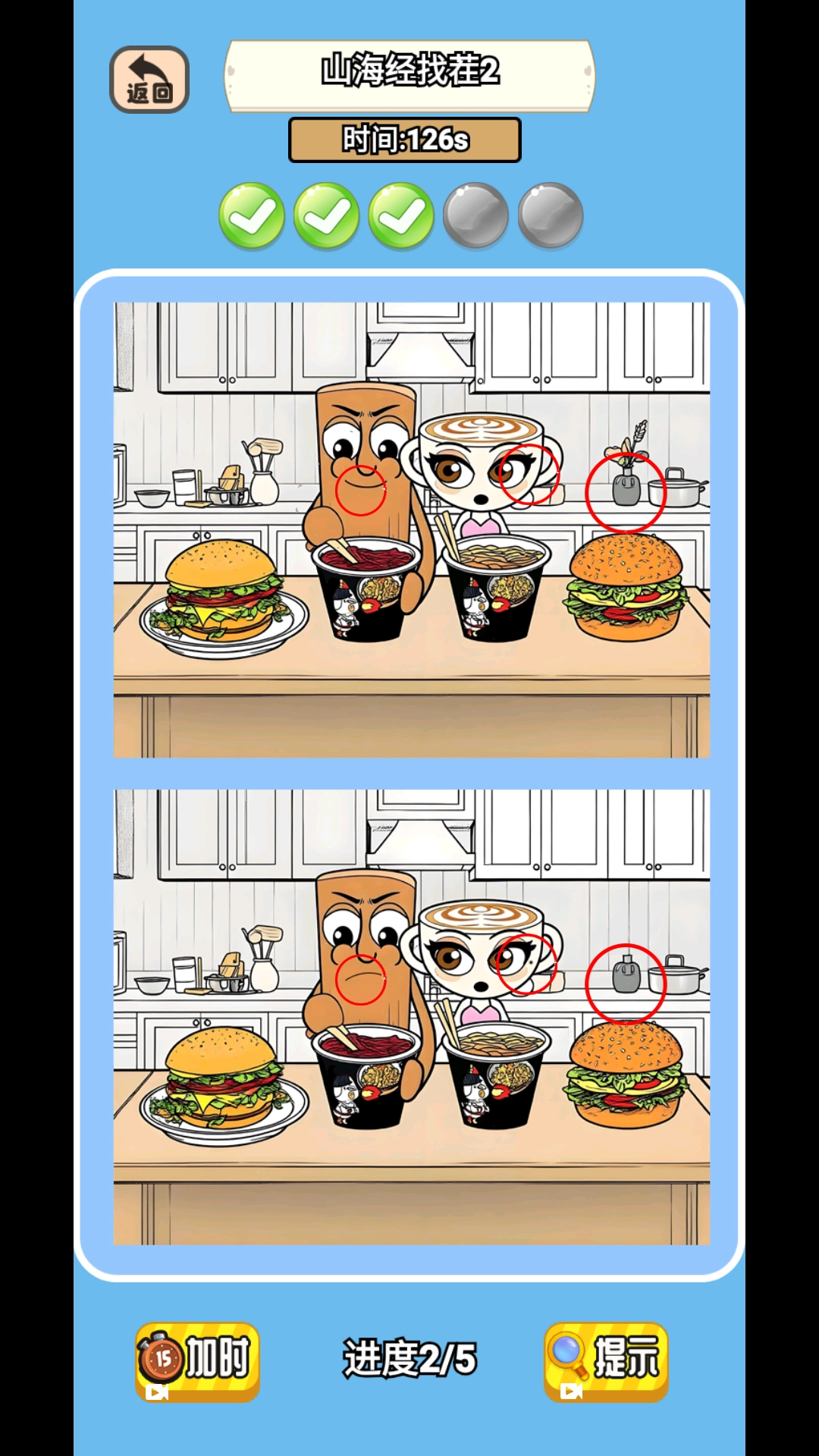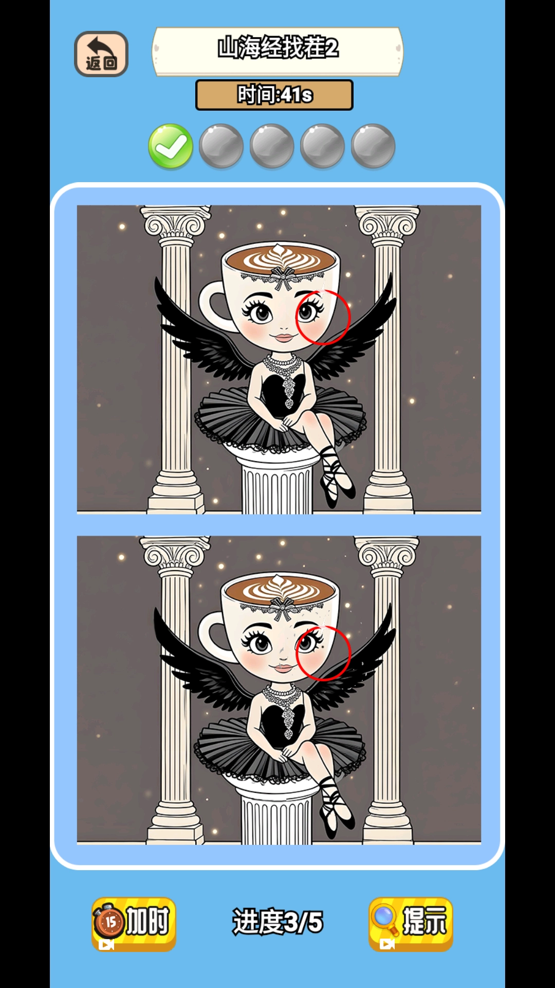 进入关卡后,仔细对比上下两张图,找出并点击它们之间的不同之处,当找齐5处差异时即可顺利通关。