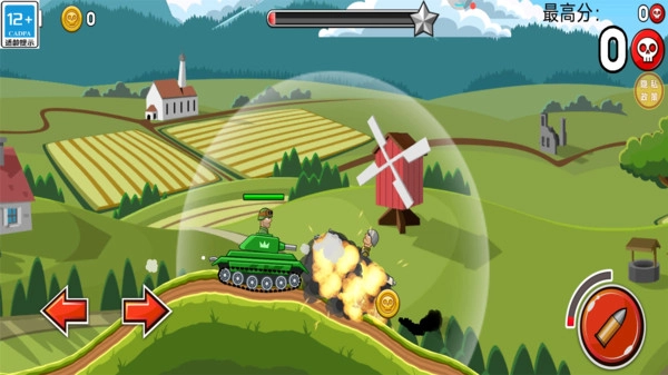 驾驶坦克穿梭于山地、田野等不同地形,通过点击射击按键来打击敌方坦克,同时避开障碍物持续推进。