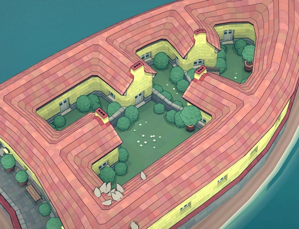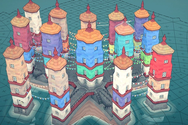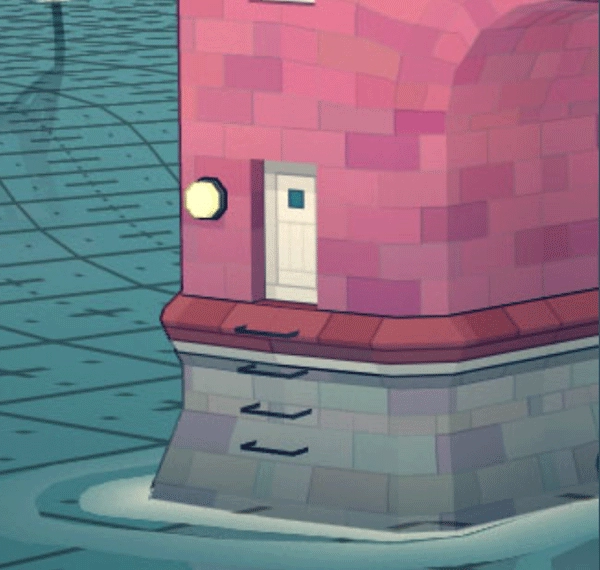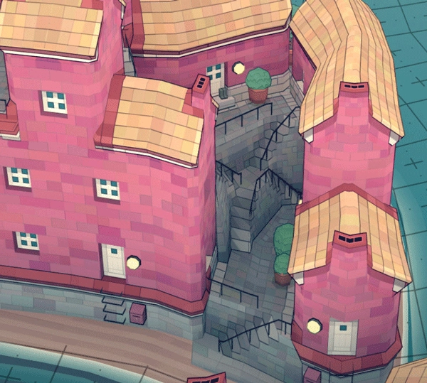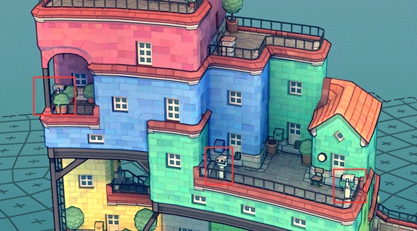 ②要保证房屋的颜色各不相同。要是采用了相同的颜色,缺口上方那栋房子的底部就会有脚手架显现出来。