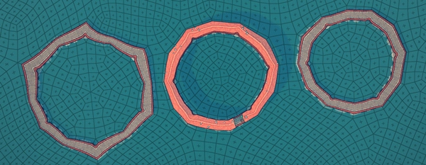 ①首先要找到符合要求的网格布局:该布局不能有过于尖锐的角,收尾相连的圆圈部分必须保持近乎光滑的状态,所有拐角的角度都不得超出特定范围。一旦拐角处的建筑触发了脚手架件,就意味着该布局不符合浮空网格布局的标准。