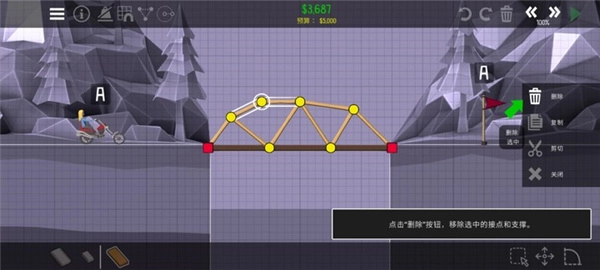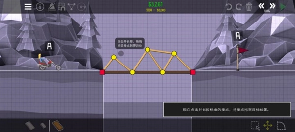:让你的车辆顺利的过关,每一个关卡中金钱都是有限的,在金钱消耗完前造出符合要求的桥梁。