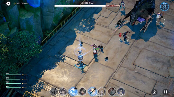 4、例如在一场boss战中,boss会交替施放多种技能来攻击玩家,有扇形技能,有召唤小喽啰的技能,有时还会暂时脱离战斗,在场边释放范围技能来攻击玩家的小队,而根据角色定位不同,也有在boss面前抵挡伤害,拉住仇恨,还有在侧面输出的近战输出,以及在后方的辅助和远程输出,总共可以带到四名角色上阵。