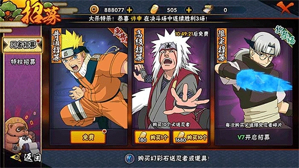1、忍者招募:在这个看脸的世界里面,所有的不得意都可以怪脸不好,在《火影忍者》里面,最看脸的玩法就是忍者招募(抽抽抽)!忍者招募的玩法是通过消耗【羁绊之卷】随机抽奖,玩家会有一定的几率抽到忍者碎片。高级招募和普通招募基本上是一样的,但由于需要消耗金币抽奖,所以每抽十次一定会送一个忍者,金币充裕的玩家们可以试一试。至于限定招募和特权招募就是土豪玩家的玩法了。