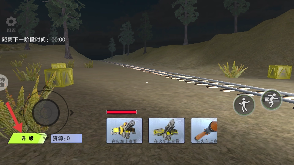 3、在场景中寻找黄色资源箱,靠近并收集资源,积累资源后点击【升级】,强化列车,推进游戏进程。