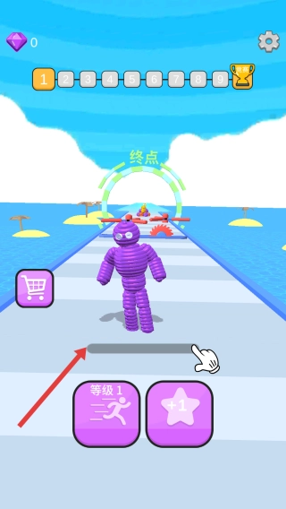 1、在游戏界面,按箭头方向滑动屏幕,操控紫色角色前进。