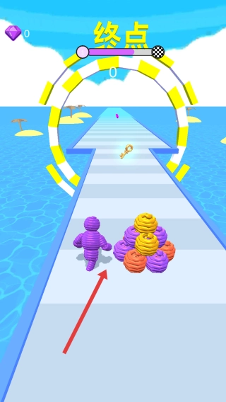 2、在前进过程中,让角色按箭头所指收集路上的彩色螺旋道具,向终点进发。