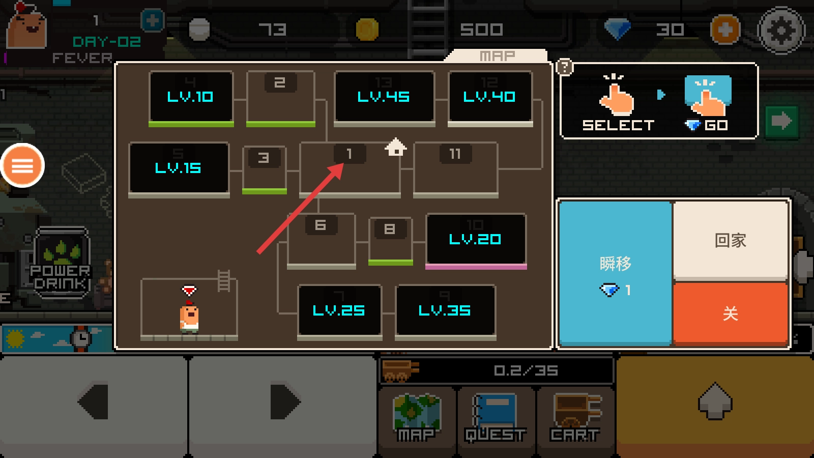 在地图界面挑选关卡(例如LV.1),推动任务进度,解锁新的资源采集区域。