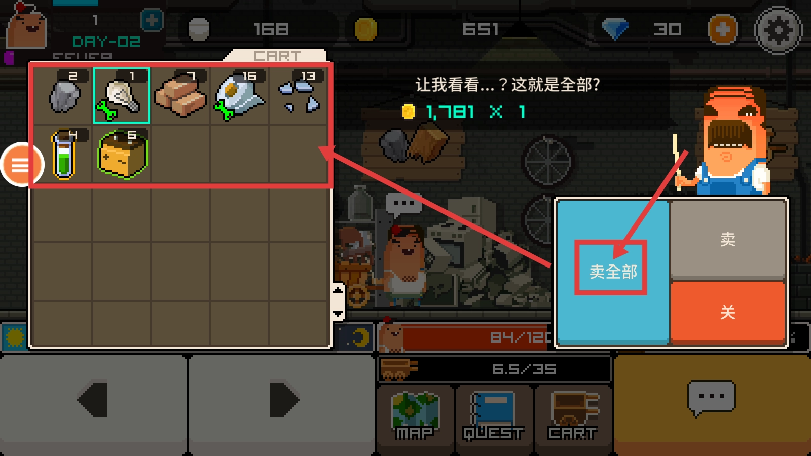在交易界面中点击“卖全部”按钮,把已收集的资源兑换成金币,以此积累资金,用于后续的升级操作或解锁新功能。