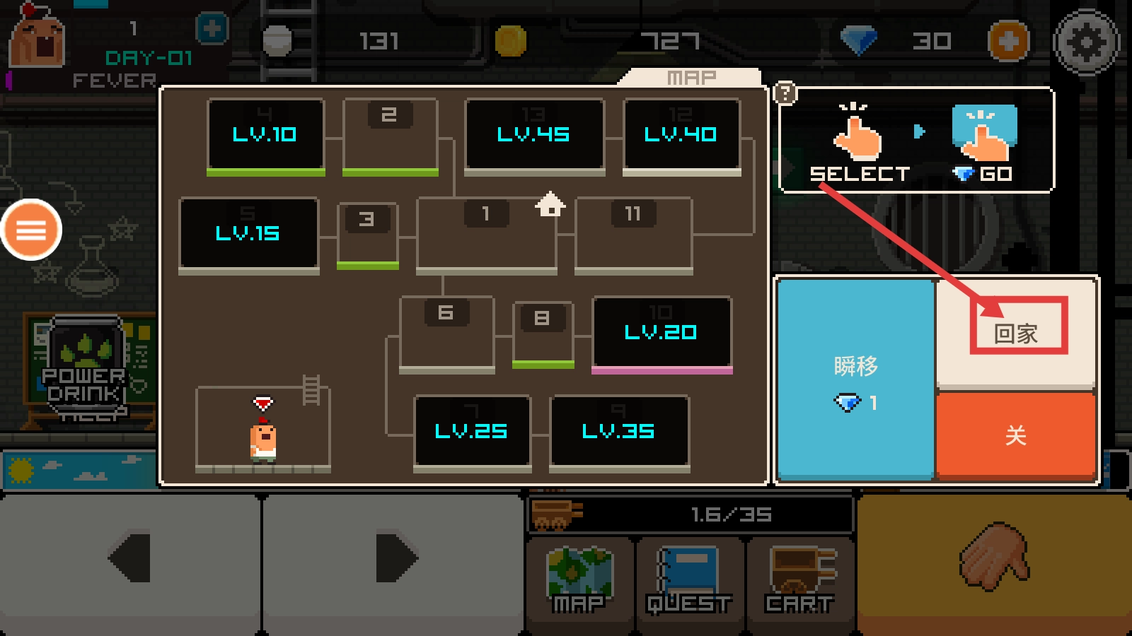 在地图界面可以选择“回家”选项,返回基地去整理资源或者开展升级相关的操作。
