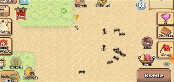 4、要指挥其他蚂蚁去攻击别的动物,得点击下方的battle按钮,这里也能查看血量情况。
