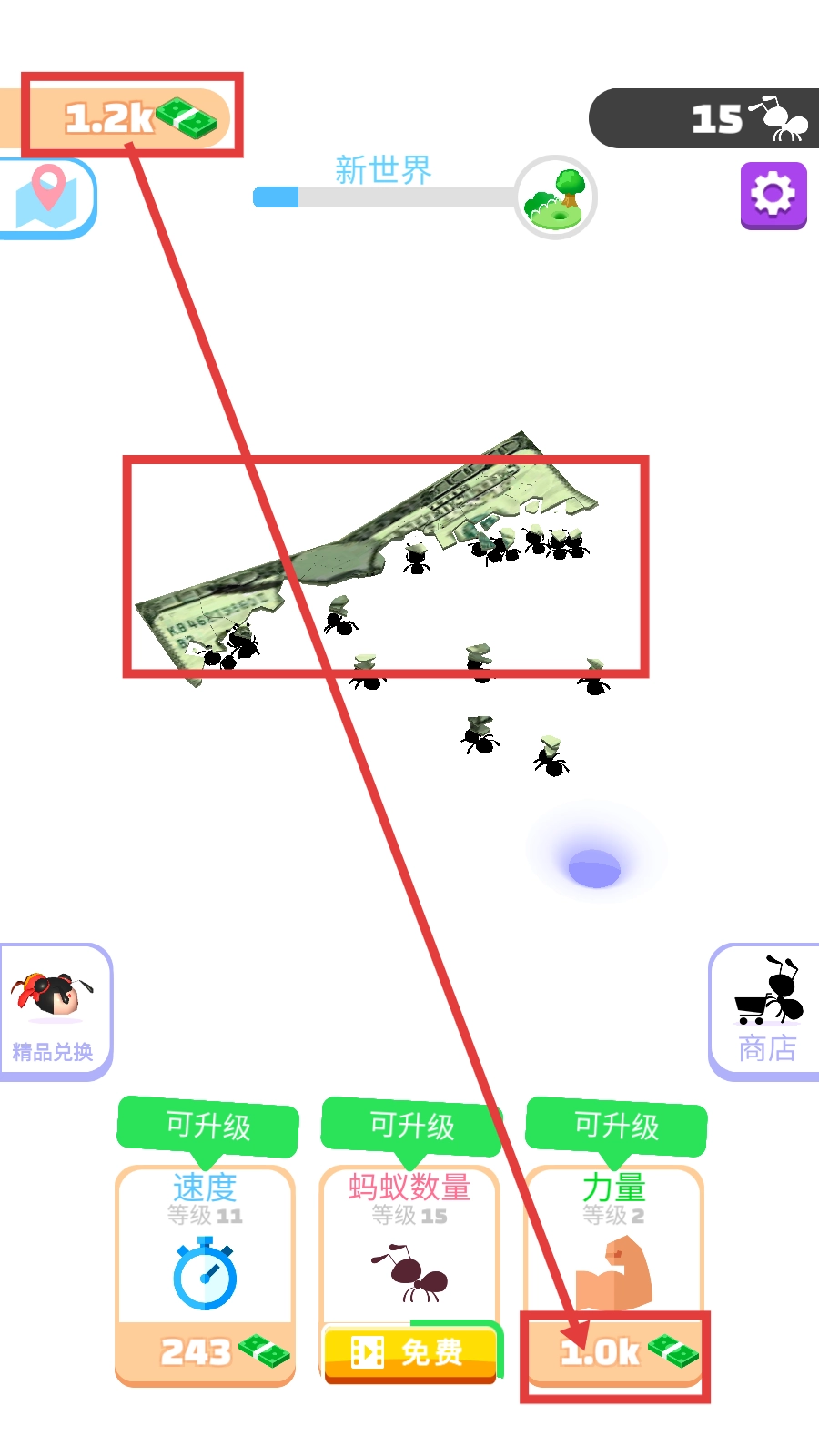 当资金积累到1.2k时,建议优先升级【力量-1.0k】,这样可以让蚂蚁更高效地搬运大额资源,从而加快后续资金的积累速度。