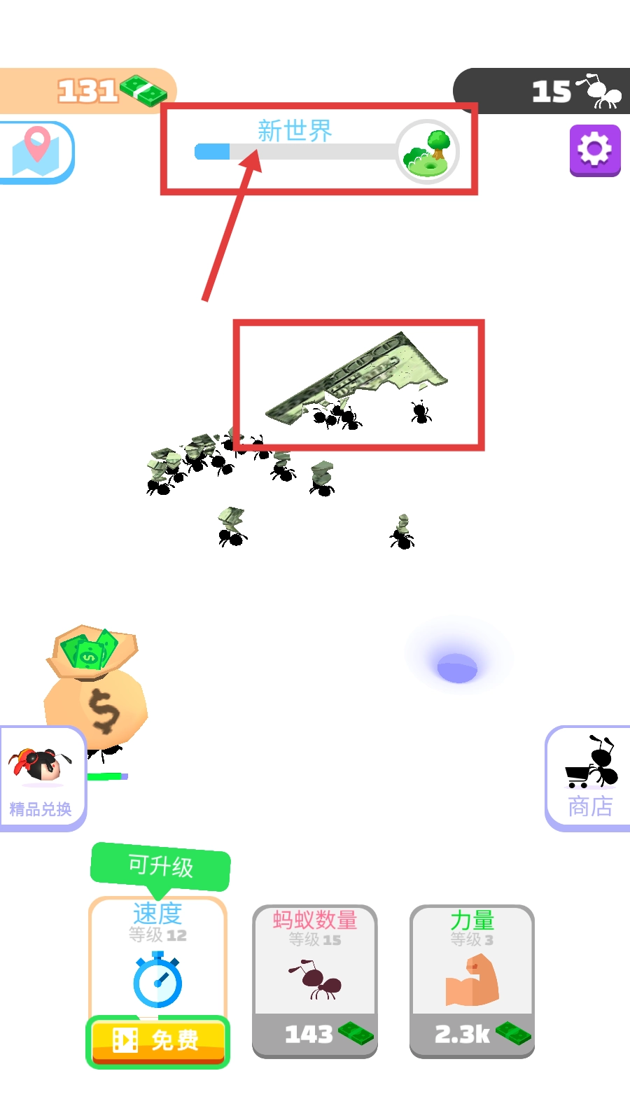 可以留意【新世界】的进度条,借助蚂蚁不断搬运资源,推动进度来解锁新的区域与内容。