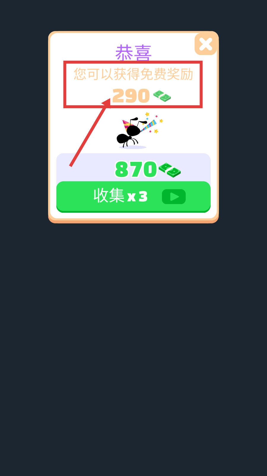 领取【免费奖励-290】资金,您可以点击【收集x3】按钮观看广告,这样就能获得三倍资金,用于进行各项升级操作。