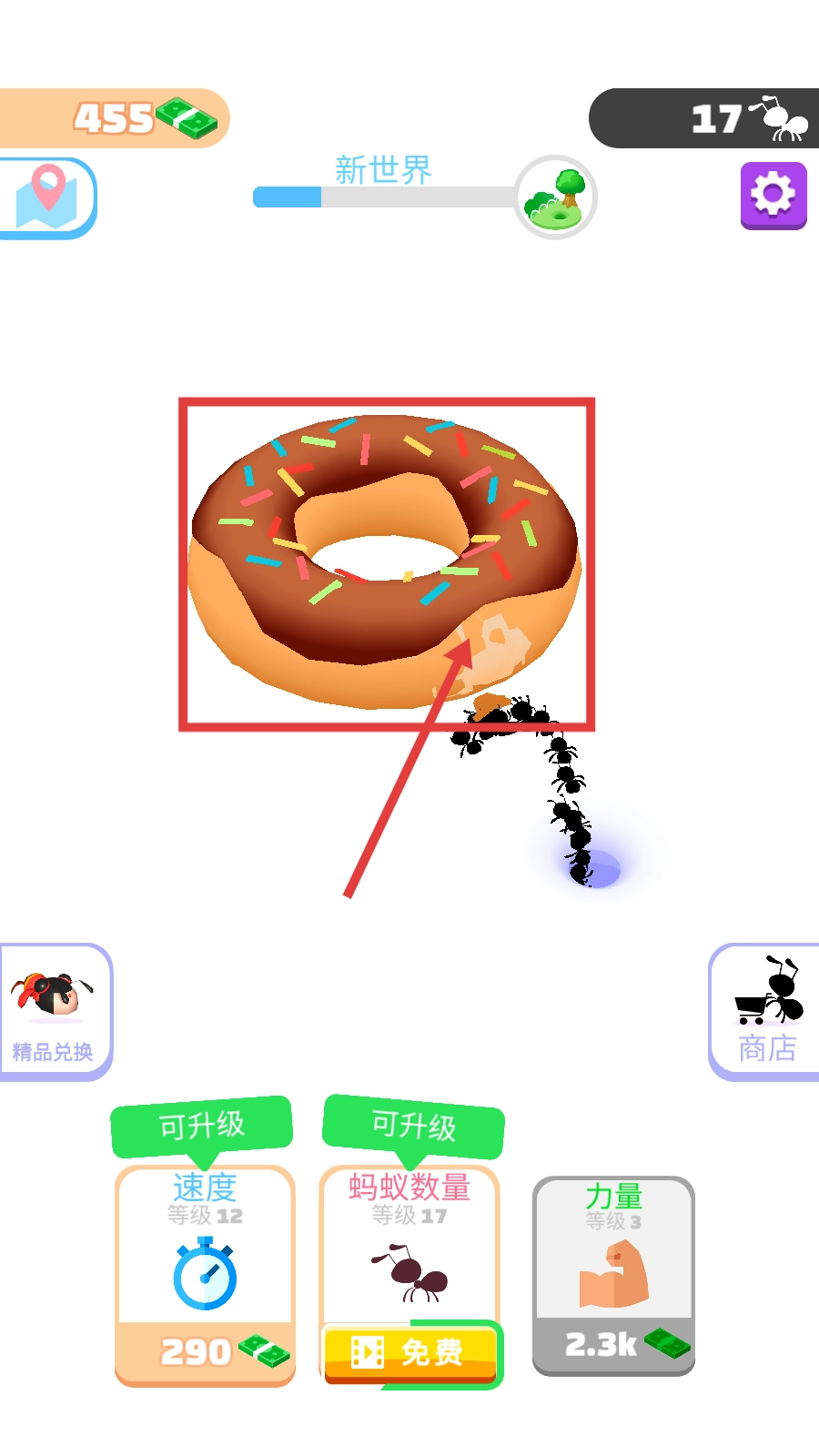 当蚂蚁搬运甜甜圈时,可通过升级【速度】与【蚂蚁数量】来提高新食物资源的搬运效率,从而快速积累资金。