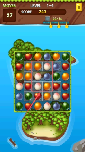 接下来,你需要在剩下的27步里,通过交换相邻的水果,让3个或更多相同颜色的水果连成一线,这样不仅要累计拿到至少240分,还得收集够16个目标水果才行。