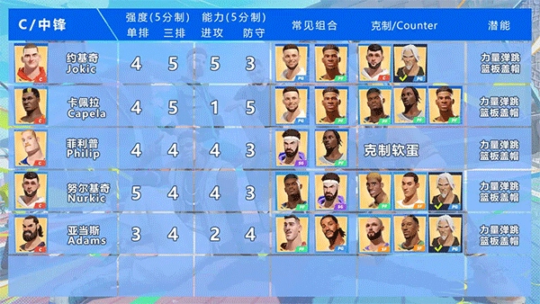 中锋位置的操作难度处于中等水平,比较适合那些热衷于篮下强攻、擅长身体对抗,并且对篮板球落点有着出色预判能力的玩家选用。