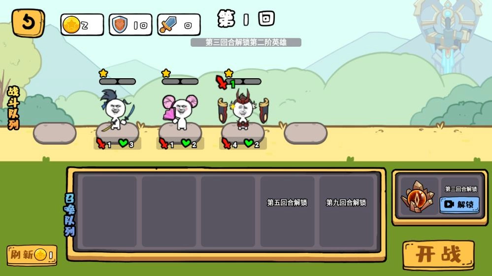 2、如下方图示,点击“刷新”按钮可获取更多英雄;若获得相同英雄,可通过合成升星的方式进一步提升其属性。