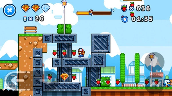 2.在关卡中收集草莓和披萨饼等道具,它们不仅能帮助你回复生命值,还能在商店中兑换各种有用的物品。