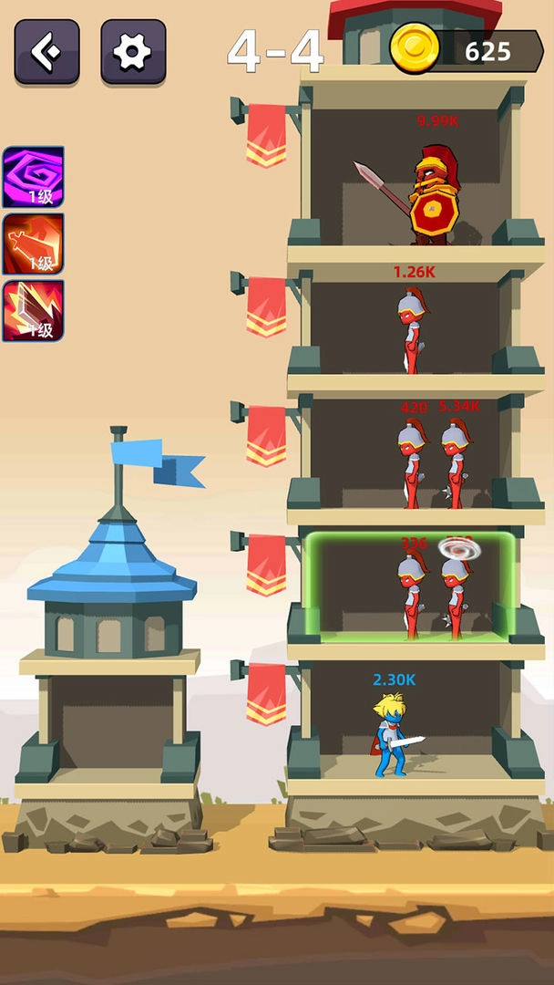 1.左边的蓝色城堡是我方阵营,右边的红色城堡代表的是敌方阵营,每一关卡分为四个小关卡,逐个通过每个小关卡才算挑战成功哦。