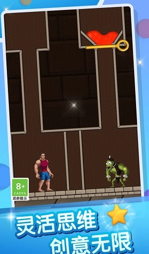 这是一款经典的密室闯关游戏,发挥你的聪明才智,帮助裤衩哥击败怪兽,救出白雪公主,顺利通过每一关吧!这里关卡丰富,奖励也十分诱人!不知为何,白雪公主被困在了一个狭小的空间里,里面还有怪兽随时威胁着她的生命安全。现在,唯一能帮助白雪公主的人就是你了:通过移动空间内的横杆,借助空间里的水源或气体,协助裤衩哥巧妙地与小怪兽周旋,成功营救白雪公主。每完成一次救援,你都能获得金币奖励哦!