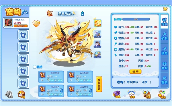 在信息界面可查看当前宠物的基础信息能力值,并进行培养操作,包括:努力值分配、技能配置等。