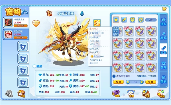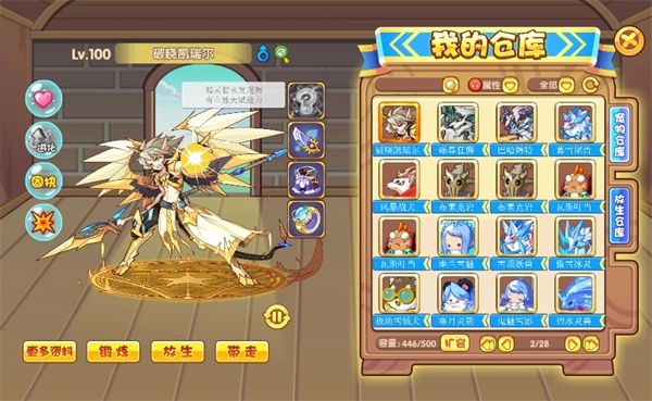 点击界面右下方的按钮,可将宠物放入锻炼或打开仓库(VIP用户特权)及恢复状态等。