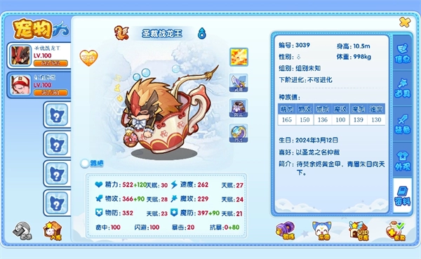 在资料界面可查看当前宠物的编号、喜好、简介、种族值等基础信息。