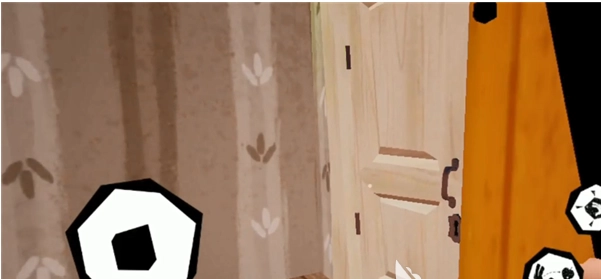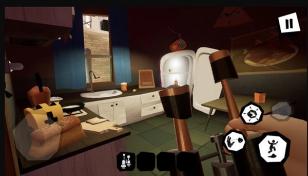 游戏采用第一人称视角,带来了强烈的代入感。尤其是开局阶段,当大叔发现主人公时,主角挥舞双手、不知所措,邻居却径直冲向你,画面逐渐变暗,那张放大的脸越来越近,最终消失。而到了后续章节,玩家其实可以与邻居对抗、挣扎,甚至找机会逃走。
