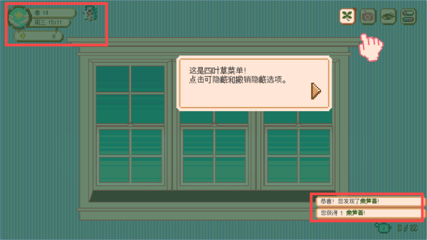 请留意左上角的日期与资源信息,点击【这是四叶草菜单!点击可隐藏和撤销隐藏选项】即可进行界面操作,让游戏体验更顺畅。