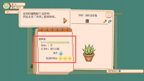 给植物取好名字后,就能查看它的详细信息了,比如【崇芦荟Lv.1,年龄:1天,已浇水:很久以前,每天,充足的阳光】这类内容,然后按照要求去照料植物就行。